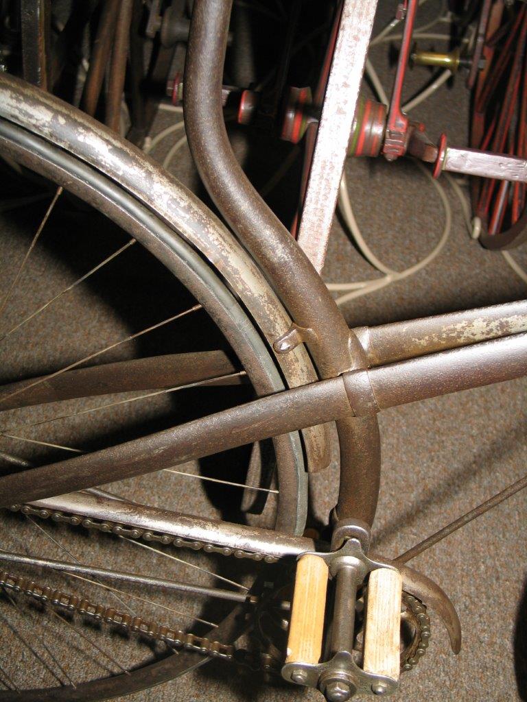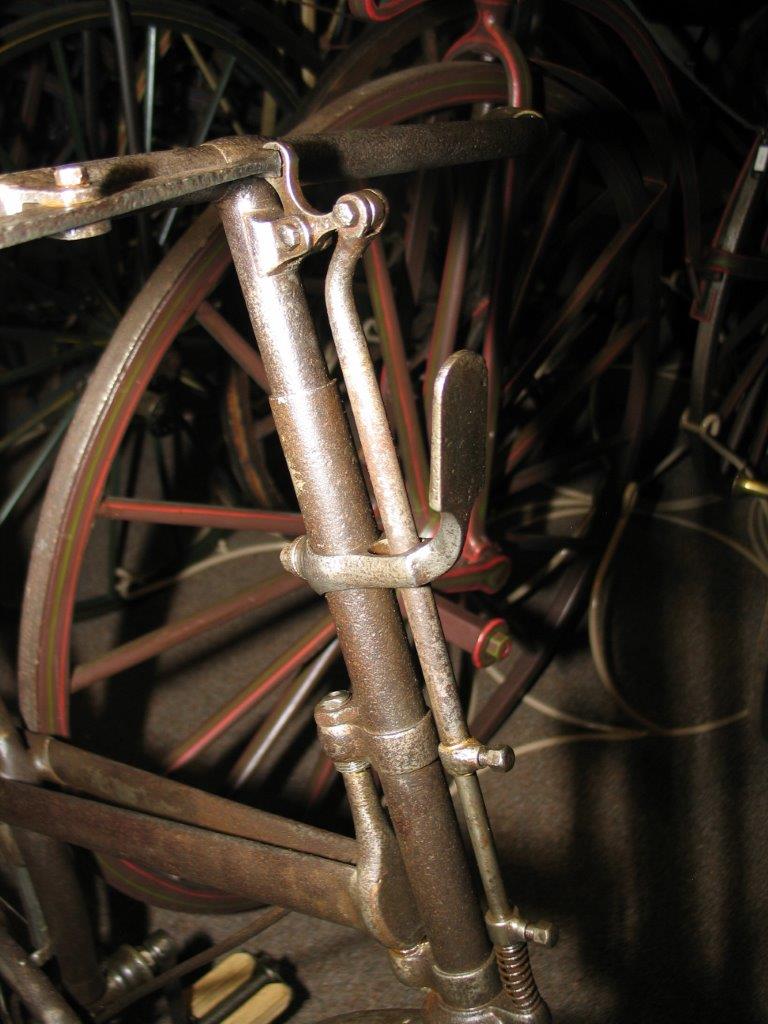 It is a very characteristic bike, which has a lot of details in common with the famous 'open head' Bayliss, Thomas ordinaries. Look here, and you will see that the twin frame tubes really look like the fornt fork of the older bicycles. No other firms made safety bicycles with this construction.